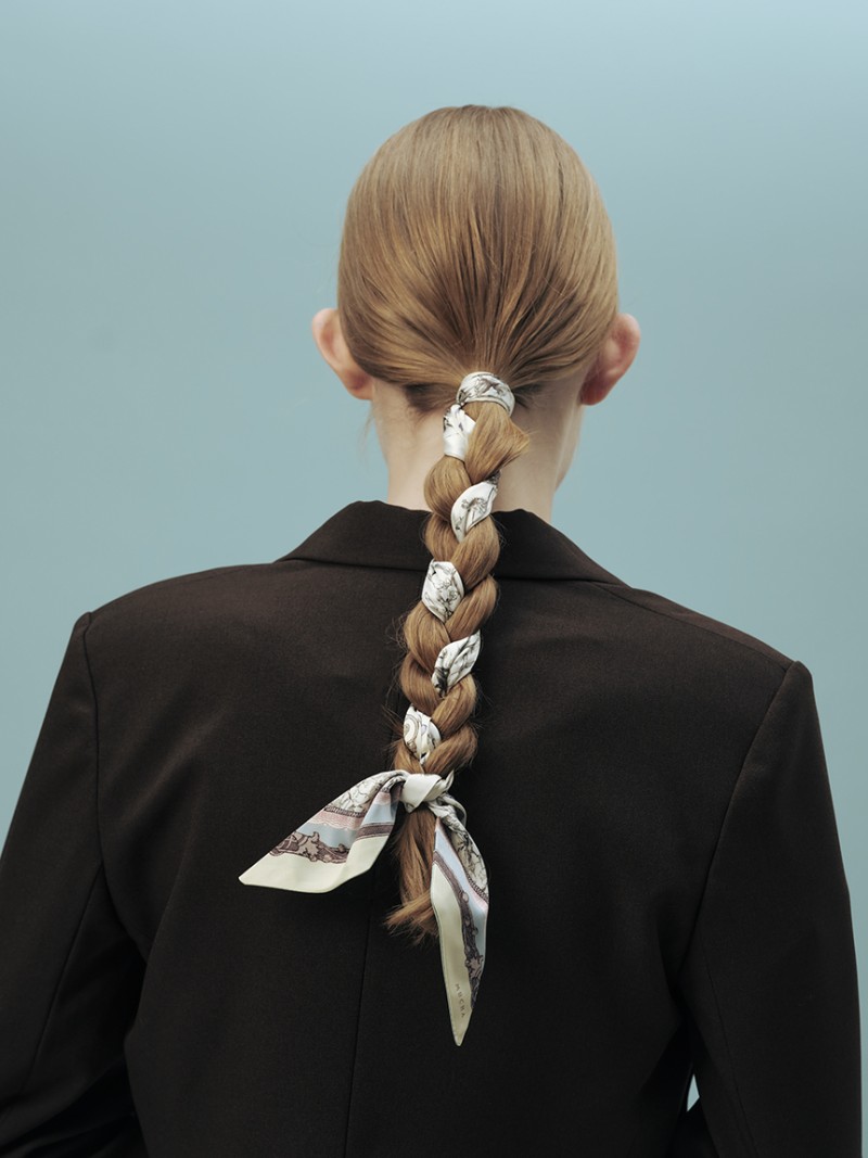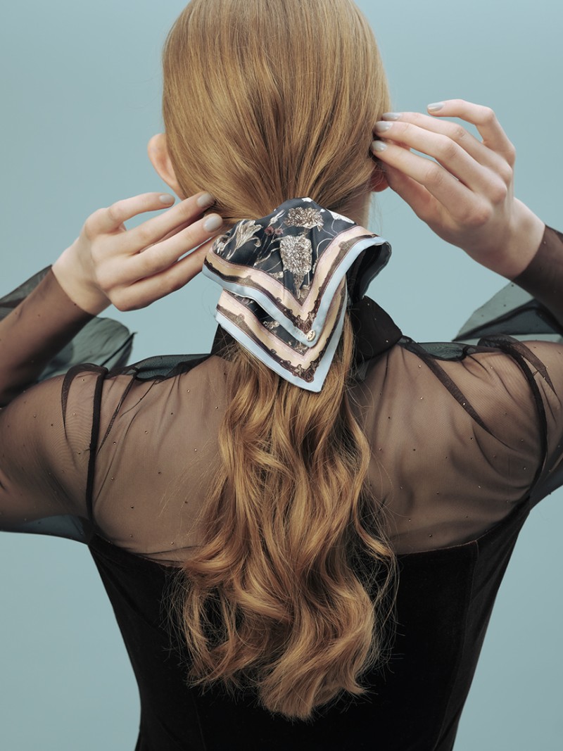 スカーフを巻いているように柄が美しく見えるデザインで、まとめ髪に添えるだけで、ぱっと華やかな印象演出します。
