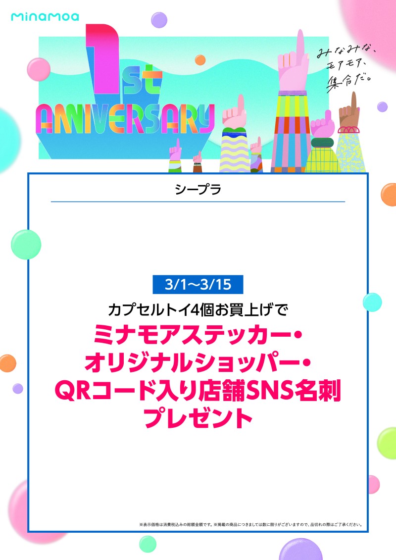 カプセルトイ4個お買上げでミナモアステッカー・オリジナルショッパー・QRコード入り店舗SNS名刺プレゼント