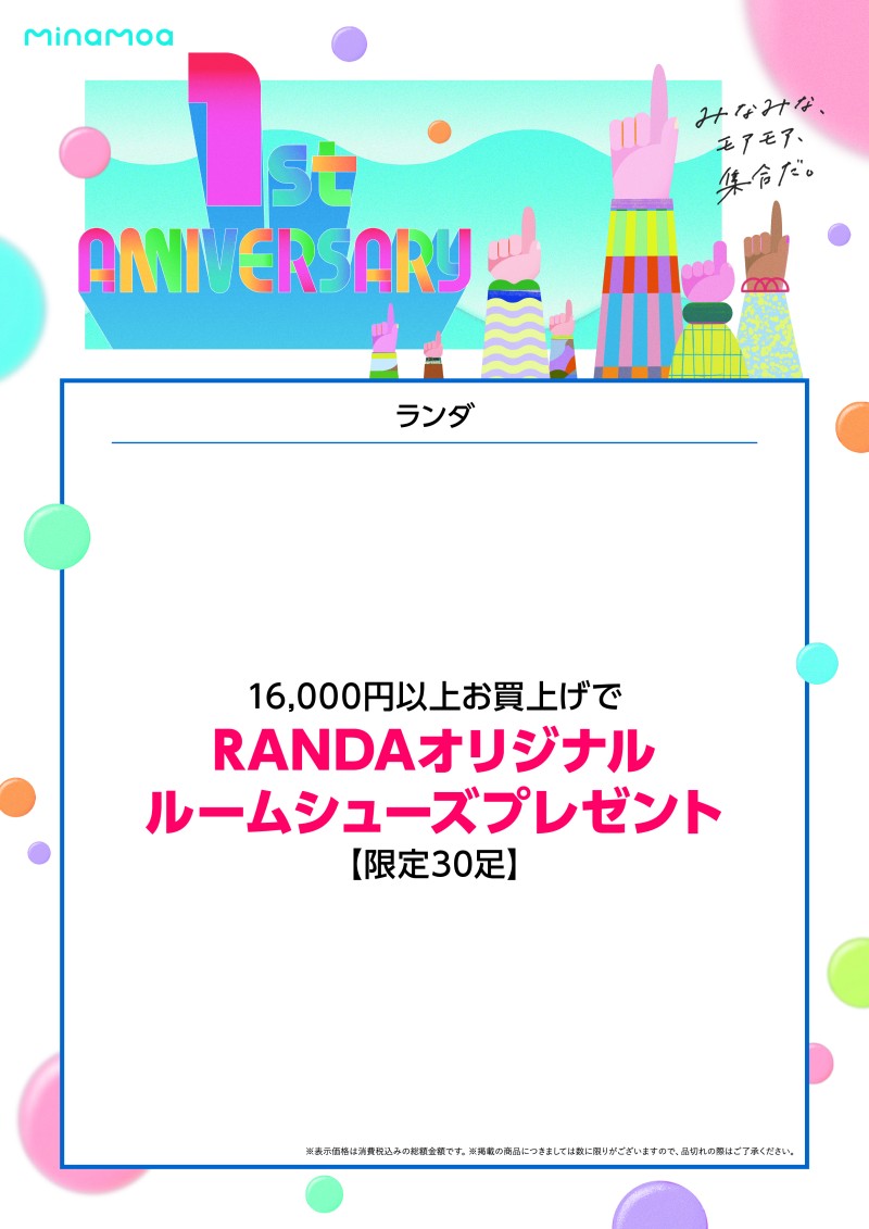 2026.03.05 NEW 【RANDA】ミナモア1周年フェア 16,000円以上お買上げでRANDAオリジナルルームシューズプレゼント ※限定30足 RANDA ランダ カテゴリー ファッション グッズ 業態 レディスシューズ フロア minamoa 4F ファッション MAP 電話番号 082-258-9436 営業時間 10:00~20:00 ショップ詳細 BACK