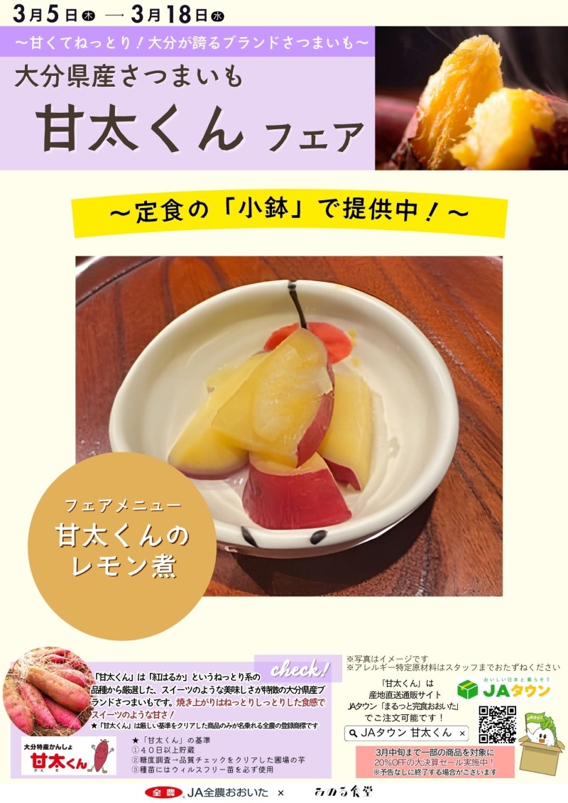 大分県産さつまいも「甘太くんのレモン煮」を定食の小鉢で提供中!