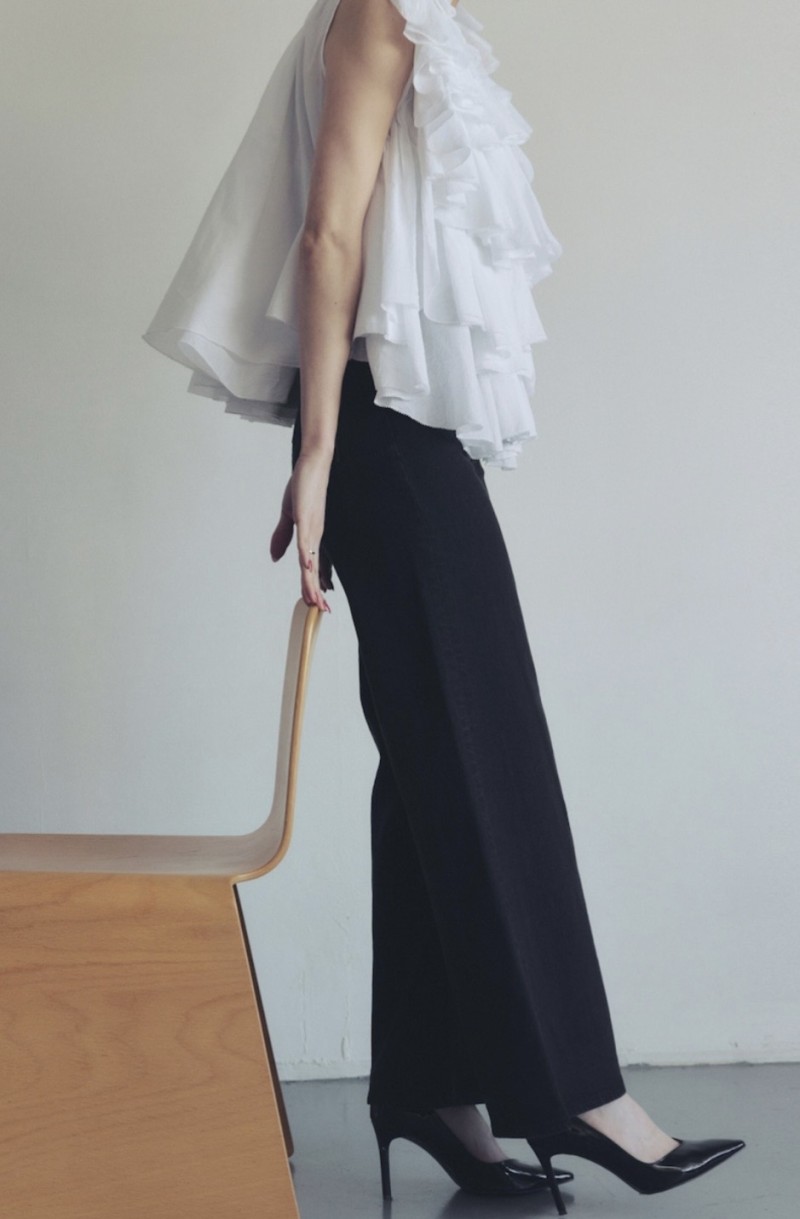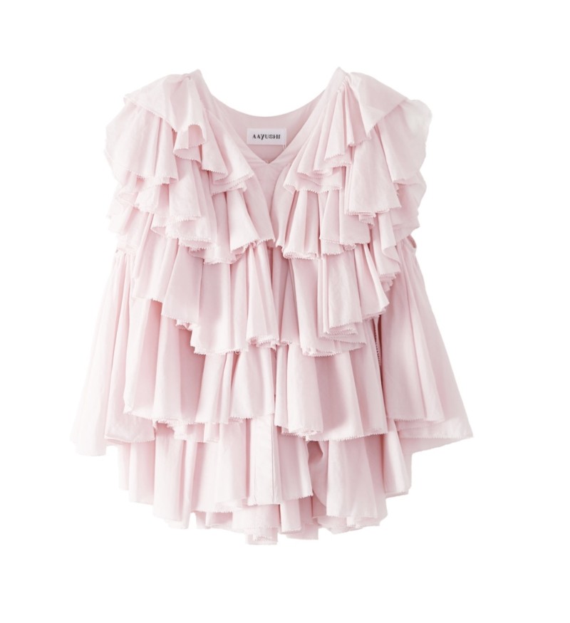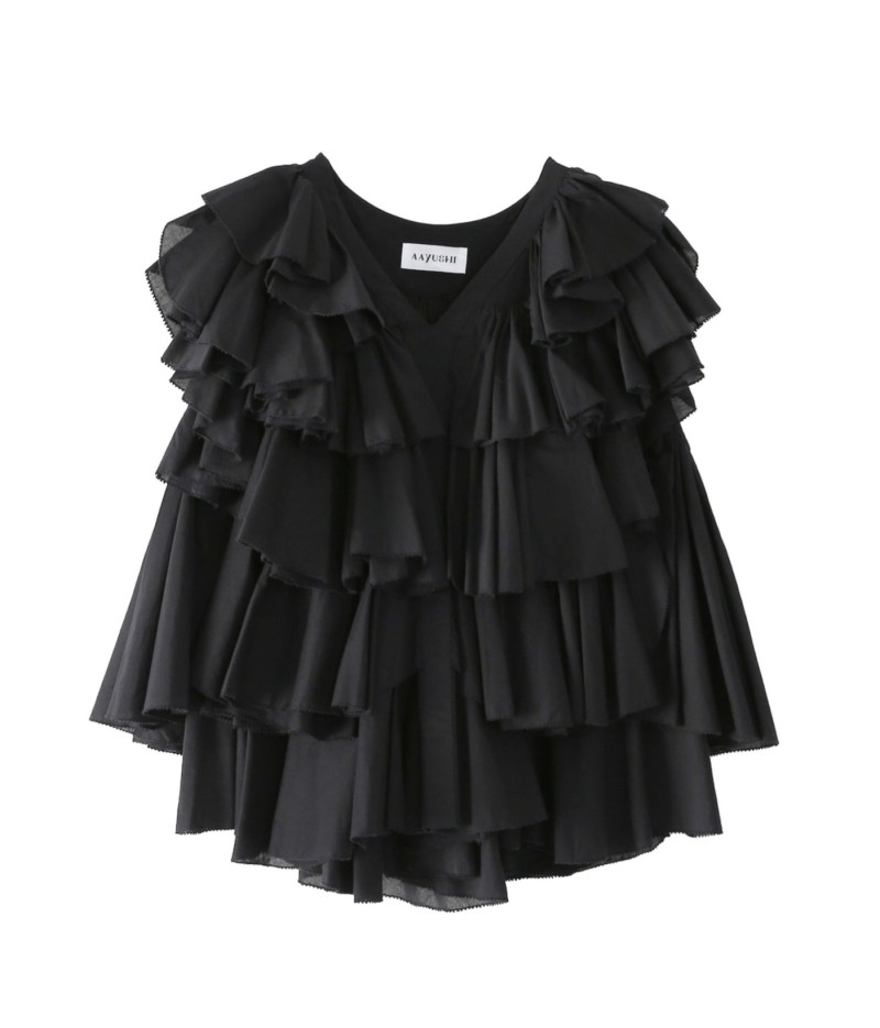 驚くほど軽やかで透き通るような透明感があり、ボリュームのあるラッフルも重たさを感じさせず、ふんわりと空気を纏うような着心地を実現しています。