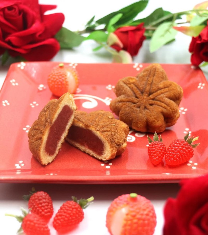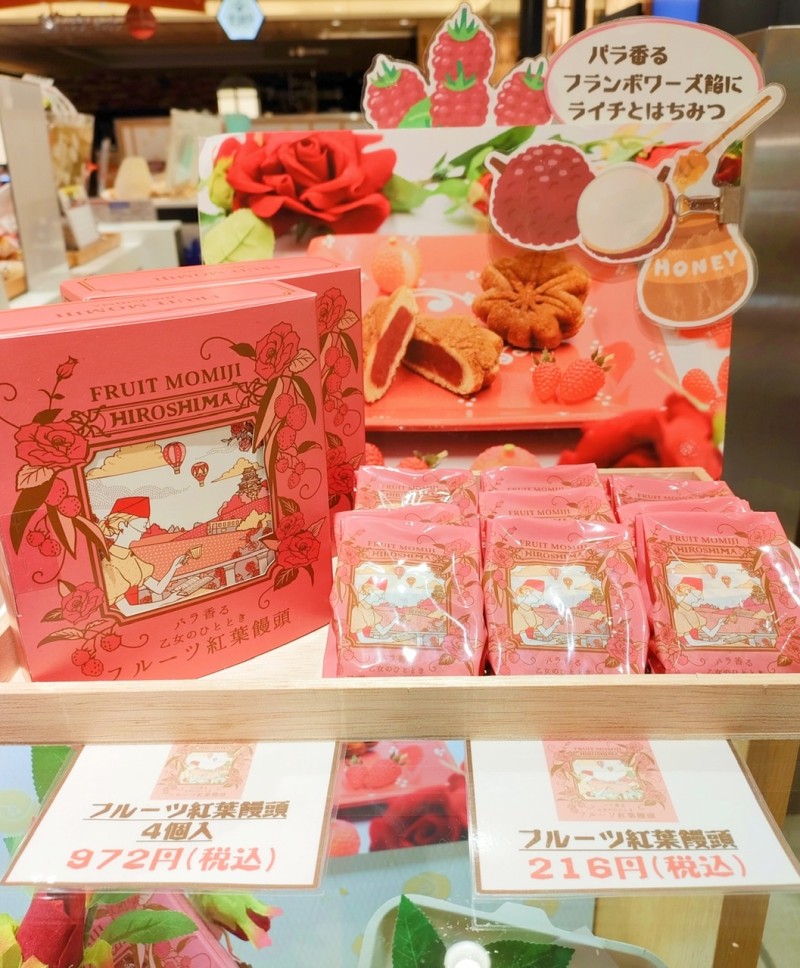 ラズベリーと宮島蜂蜜に、バラとライチの風味を加えた餡のもみじ饅頭です。
