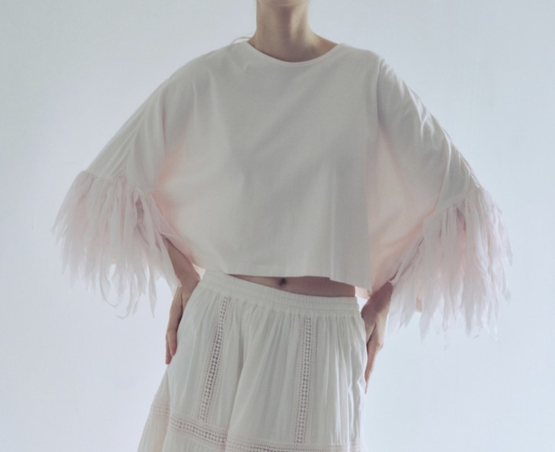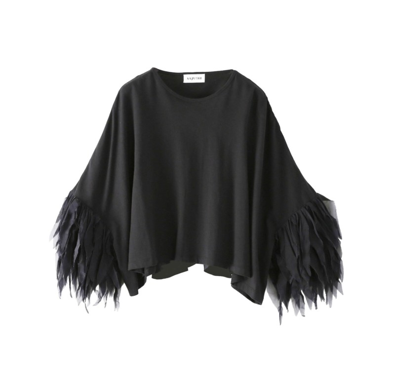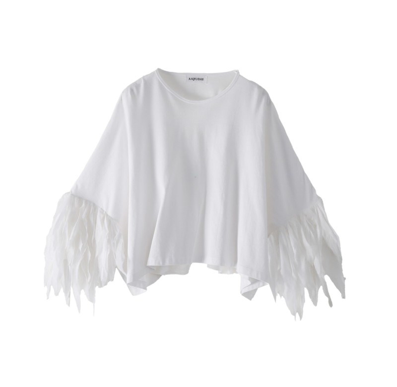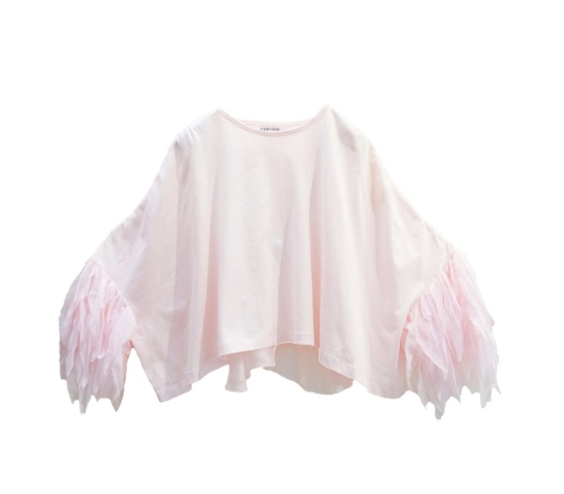 一見シンプルなボックスシルエットのTシャツの袖にあしらわれたフェザーフリル😍