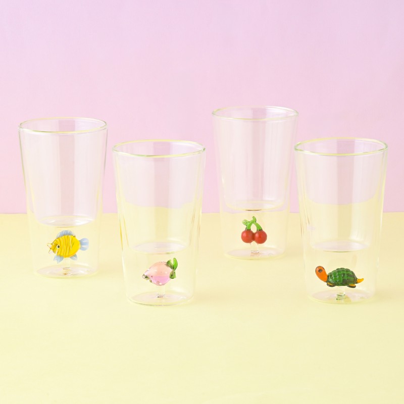 ガラス細工で作られたキュートなモチーフがグラスの底に入った、ダブルウォールグラスです。