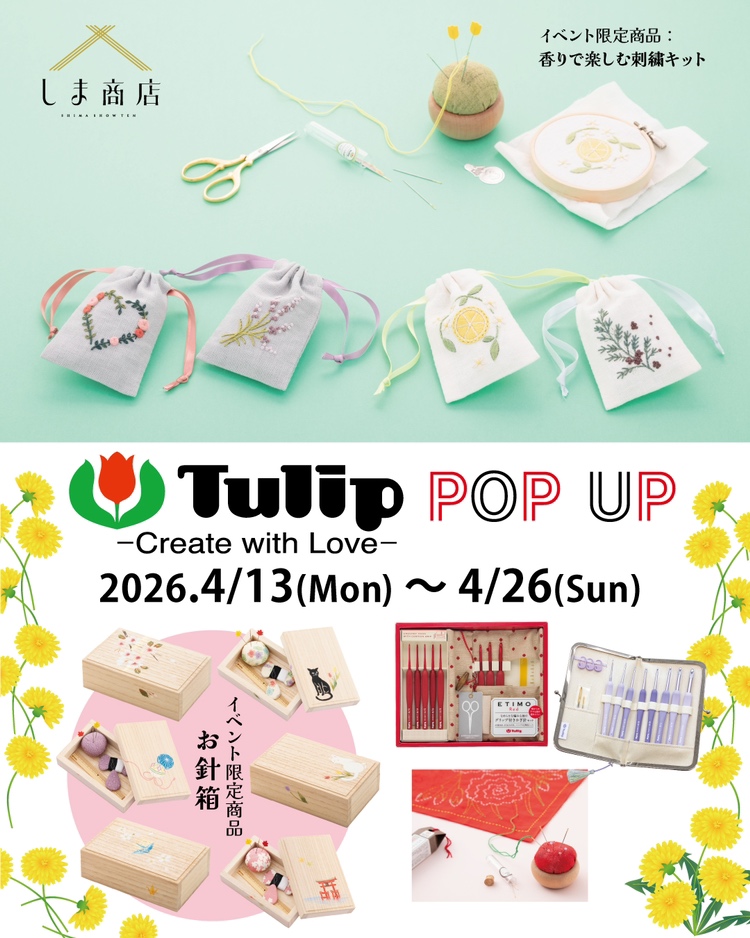 4月13〜26の間しま商店では広島針のブランド、チューリップのポップアップを開催致します。