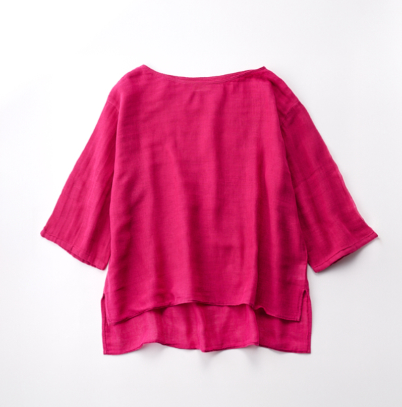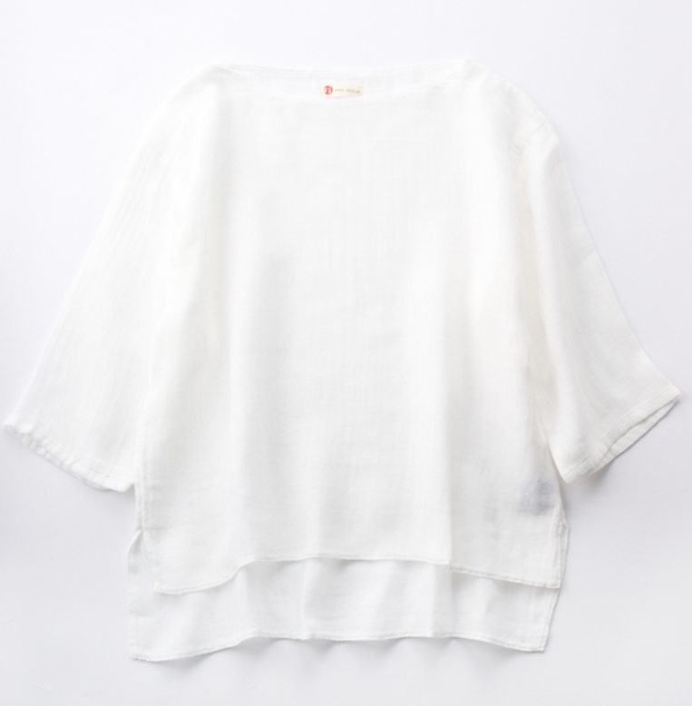 後ろの丈が長いテールカットで女性らしく抜け感を意識したボートネックの七分袖タイプです。