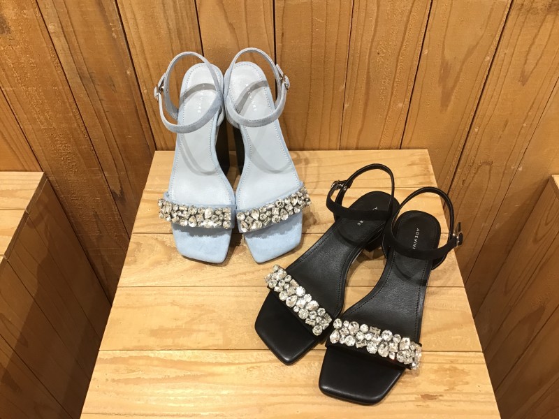 存在感のあるビジュー使いが華やかさのあるスクエアトゥサンダル☆