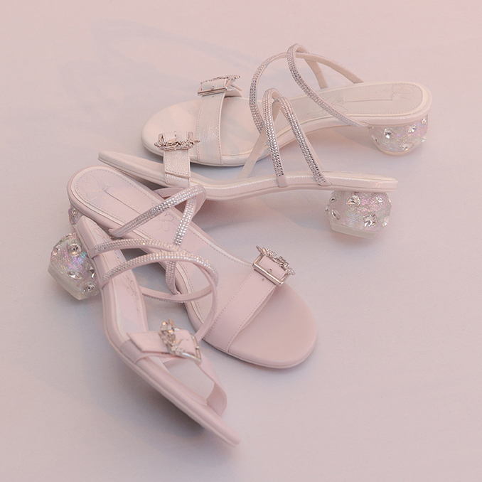 オリジナルのバタフライモチーフのヒールはキャッチ―ながら、ビジューやオーロラ加工を施し、涼しげで女性らしいデザインに仕上げました。