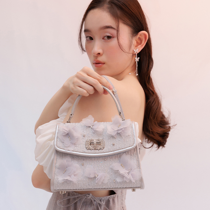 エアリーなバタフライモチーフの装飾が映えるフラップバッグ。